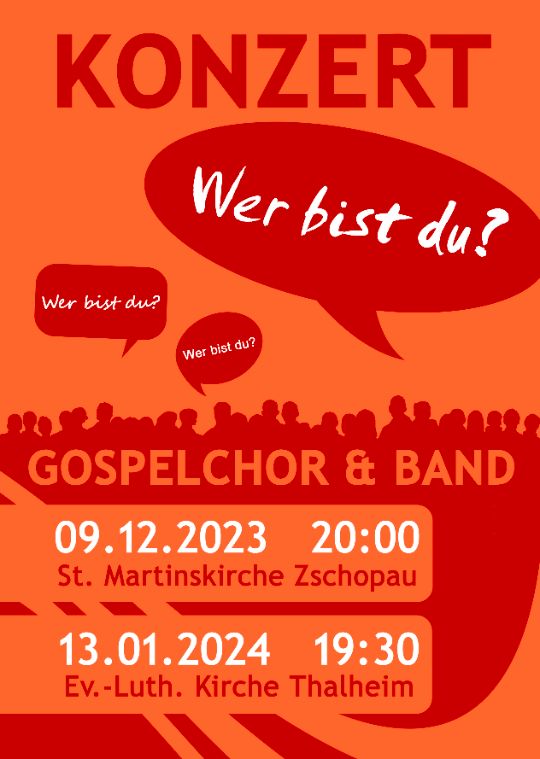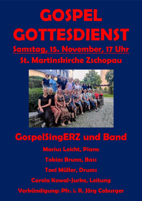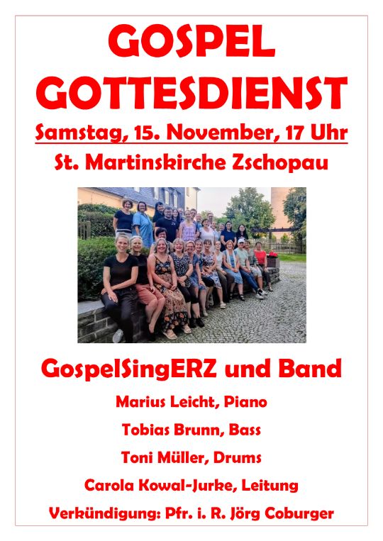 Unser neues Gospelprojekt unter Leitung von Jonathan Leistner und Carola Kowal-Jurke beginnt ab 18.10.23 - jeweils mittwochs um 19.30 Uhr - Schlossberg 3, Zschopau. Jeder und Jede, die Lust am gemeinsamen Singen haben, kann mitmachen. Das Konzert findet am 9.12.23 in der Kirche in Zschopau statt und im Januar noch an einem anderen Ort.